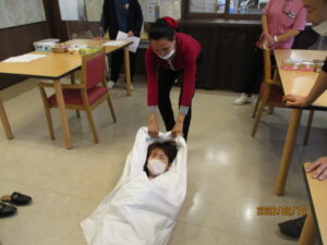 シーツを使用し一人での搬送の練習